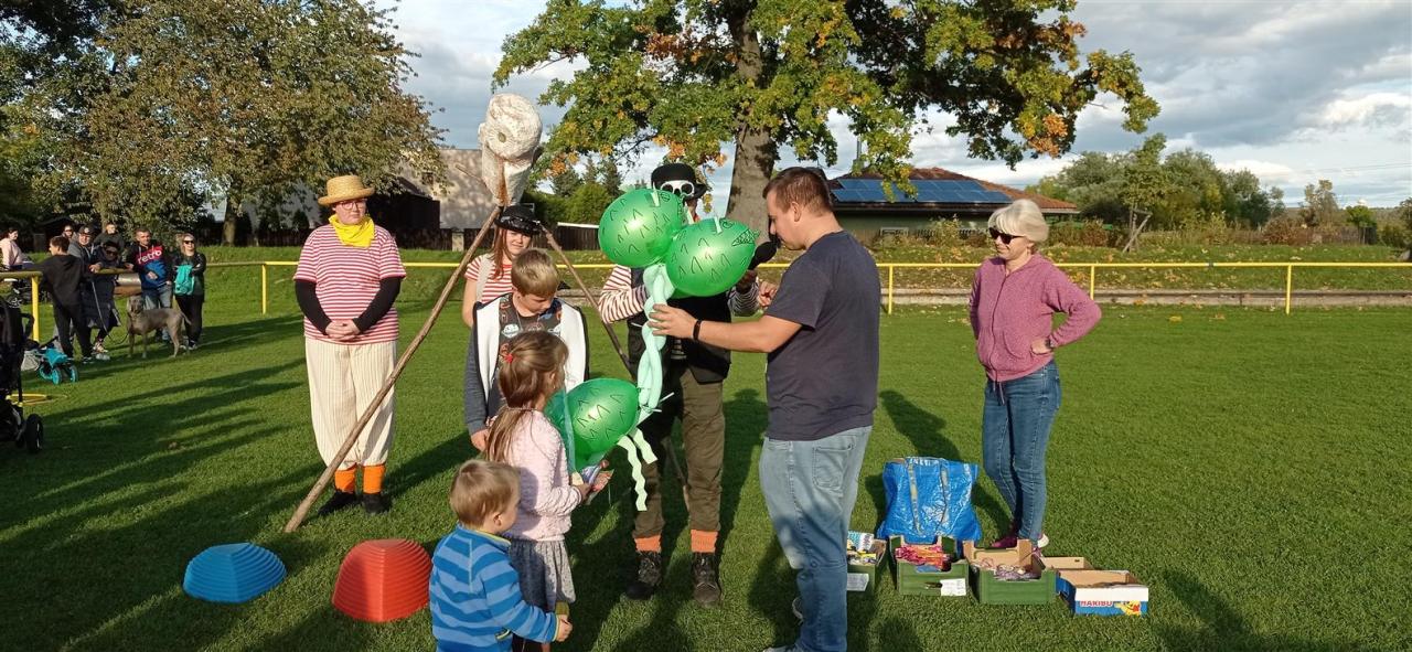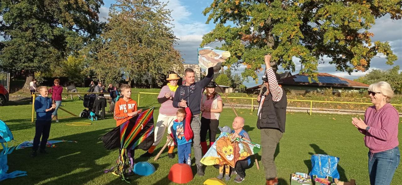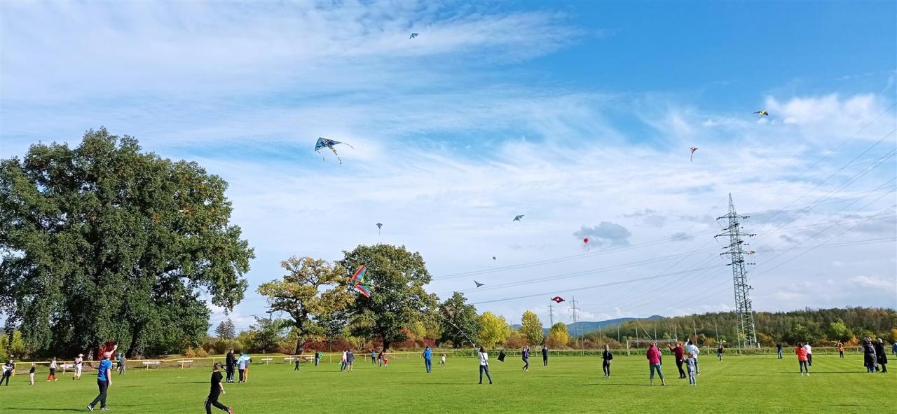 Počasí nám přálo, přesně v 15 hodin začal foukat vítr, vysvitlo sluníčko a mohlo se začít. Celým odpolednem nás provázel Petr Stolař a jeho Divadlo V Pytli, který nám tentokrát připravil i výborné občerstvení. Rodiče a děti si zasoutěžili, děti dostaly medaile, sladkost a hračku. Na konci drakiády byl vypuštěn tříhlavý drak s připevněným přáním na těle, kterého přímo pro tuto příležitost vyrobila Eliška Kubáčová s rodiči. Po vypuštění si to drak namířil přímo do koruny stromu, kterou však neuvěřitelným způsobem prolétl a vydal se směrem na Teplice. Troufáme si říci, že se celá akce vydařila a už se těšíme na drakiádu v roce 2023.
