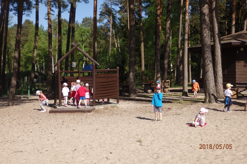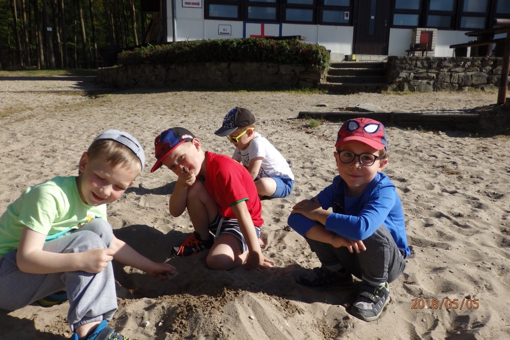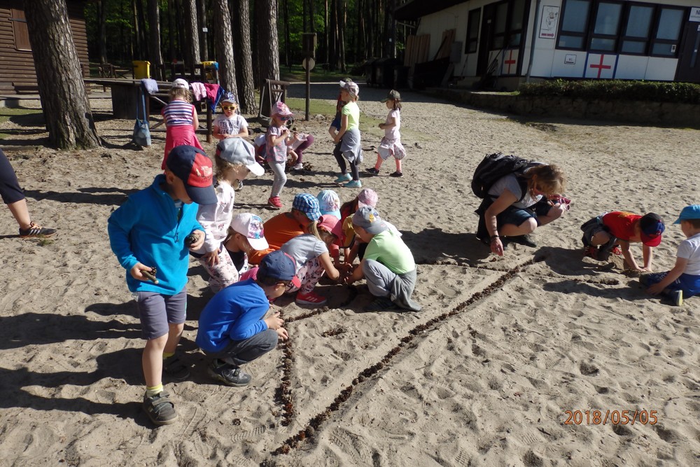 U Stříbrného jezera jsme postavili naše první teepe ze šišek a pohráli si v písku.